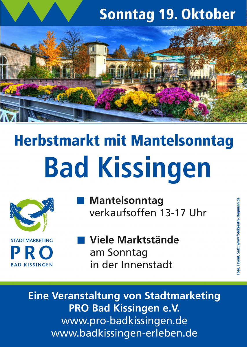 Die kalte Jahreszeit steht vor der Türe und die neue bunte Herbst-/Winterkollektion präsentiert sich in den Schaufenstern und Geschäften. Bad Kissingen lädt ein zum Herbstmarkt am 18. und 19.10.2025 mit traditionellem offenen Mantelsonntag von 13 – 17 Uhr.