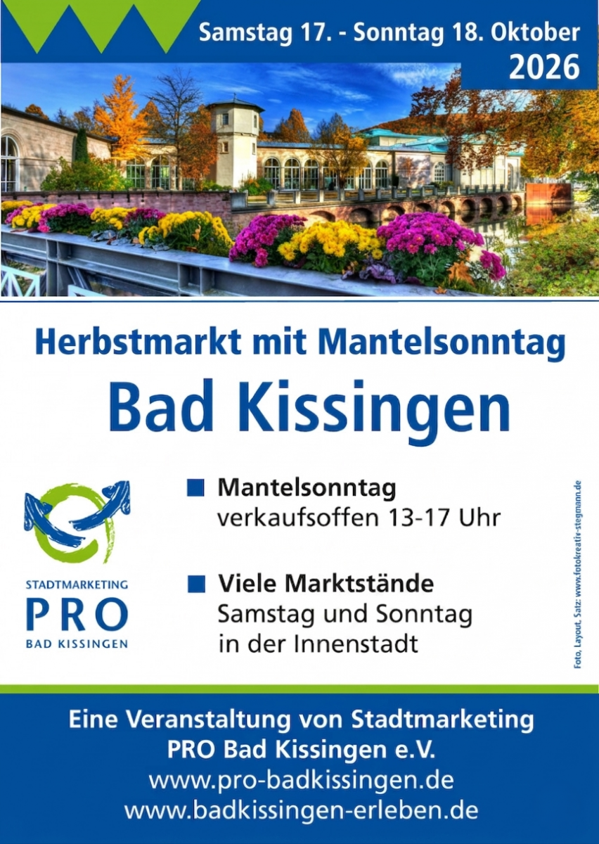 Die kalte Jahreszeit steht vor der Türe und die neue bunte Herbst-/Winterkollektion präsentiert sich in den Schaufenstern und Geschäften. Bad Kissingen lädt ein zum Herbstmarkt am 18.10.2026 mit traditionellem offenen Mantelsonntag von 13 – 17 Uhr.
